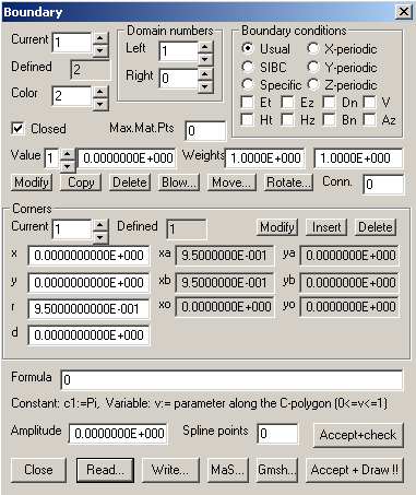 The Boundary dialog displays the current boundary data and allows you to edit or modify this data. A OpenMaXwell boundary is a C-polygon with additional data defining 1) the domain numbers to the left and to the right hand side of the C-polygon, 2) the drawing color of the C-polygon, 3) two boundary values (the meaning of which depends on the solver being applied), 4) the weight of the boundary when MMP is applied, 5) the boundary conditions to be fulfilled when MMP is applied, 6) the connection flag for boundaries that are attached to a connection, 7) a formula with an amplitude and a number of spline points.