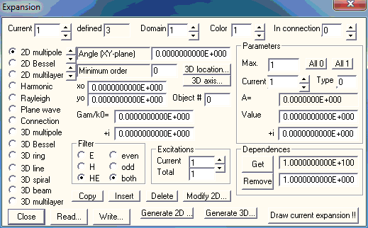 By default, you specify Object # 0. But in 3D computations you may associate each expansion with a certain 3D object number. Furthermore, you may specify a negative object number for any expansion. In this case, the corresponding expansion is not used when the MMP matrix is set up, i.e., it has no direct influence on the MMP result. Such dummy expansions may be used 1) in order to influence the matching point generation, namely for a local matching point refinement near the expansion and 2) as prototypes for the automatic multipole generation.