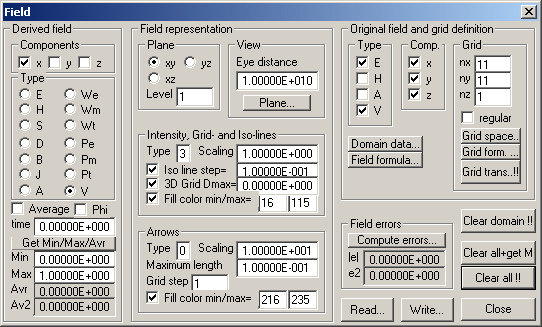 OpenMaXwell works with the three vector fields E, H, A and the scalar field V. You may turn each of them on or off in the Type group, according to your requirements