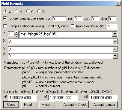 As the formula for the different components of the field often contains identical parts, OpenMaXwell offers 20 abbreviations q1, q2,…, q22 that can be specified in the text area to the right of the q box. You can select the number of the abbreviation in the q box. Only one of the abbreviations is displayed at a time. When you have modified an abbreviation, don’t forget to press Check or Accept formula!