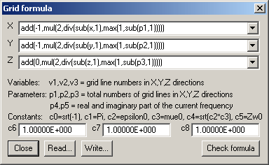 Grid formulae can contain the constants c0, c1, …c8. The meaning of the constants, c0…5 is indicated in the dialog box. The constants, c6…8 are user-definable.