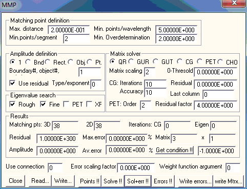 The MMP dialog allows you to set the MMP parameters and to run MMP for solving a given model. Note that an MMP model consists of the data specified in the Project, Boundary, Domain, and Expansion dialogs. When the MMP amplitude is defined by an integral the data in the Integral dialog is also required.